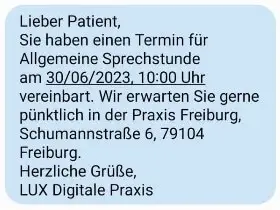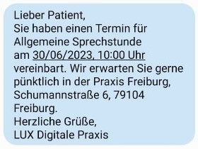 Nach der Buchung erhält der Patient eine SMS mit allen wichtigen Daten zum Termin – inklusive Datum, Uhrzeit und Praxisadresse.