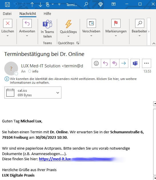 Zusätzlich wird dem Patient eine E-Mail mit der vollständigen Terminübersicht versendet. Auch die Praxis erhält eine E-Mail mit den Terminangaben.